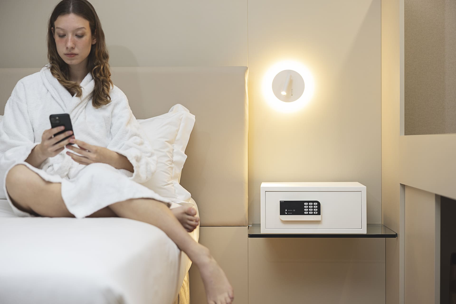Caja fuerte para hotel que destaca por su estética moderna con teclado retroiluminado y la gran variedad de funcionalidades que ofrece, como la auditoría en pantalla de más de 200 eventos. Aporta ese plus que el huésped necesita para tener una experiencia única. Disponibles en blanco y en negro y en dos tamaños, la serie Aruba presenta unas prestaciones de serie como son: Pantalla Display, apertura motorizada, luz interior, auditoría en pantalla y auditable con impresora. Como extras, se puede pedir con Enchufe interior con USB , ideal para cargar aparatos electrónicos mientras las pertenencias del huésped están a buen recaudo.