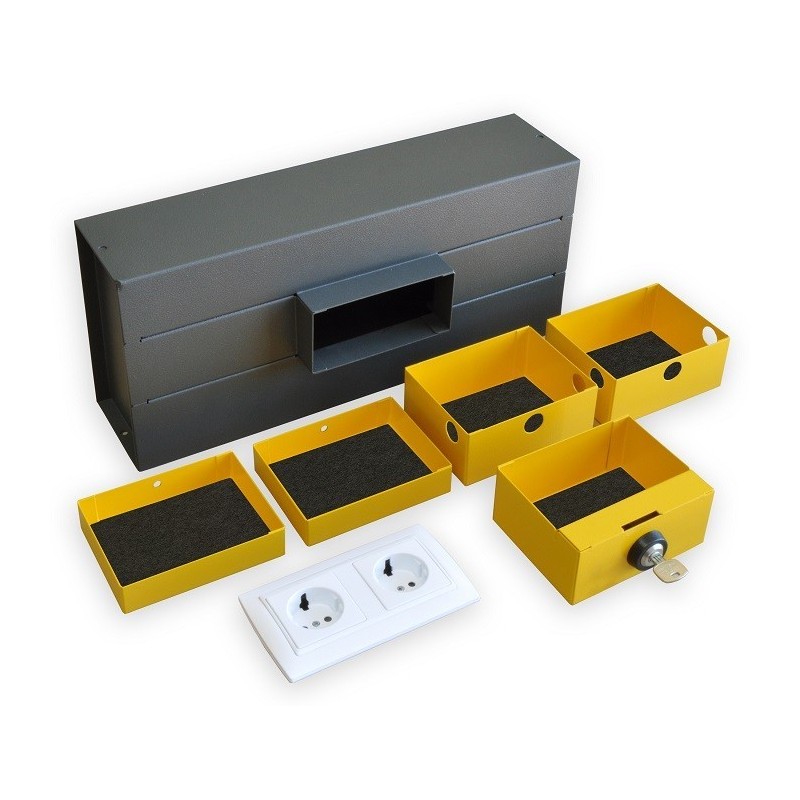 Caja fuerte para empotrar y camuflada frontalmente mediante una base de enchufes. Ideal para los pequeños objetos de valor del hogar. También se pueden adaptar la mayoría de enchufes de las principales marcas (SIMON, BJC, …).